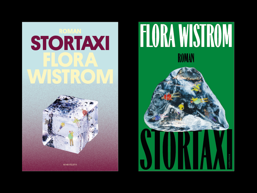 sen isbiten. idén utvecklades från att ha varit små människor som skulle trampa vatten i en cocktail och blev till modellfigurer inuti en isbit. kändes kul att få in vintern på ett subtilt sätt men isbiten kopplar också både till uteliv och drinkar och som referens till en av karaktärernas konst. två förslag: en isbit som är mer drinkig och en som är mer som en iskocka en pinande vinter. eller en diamant. floras kommentar om den gröna: Jag såg den och jag visste direkt. Och hoppades att förlaget och formgivarna skulle känna samma.