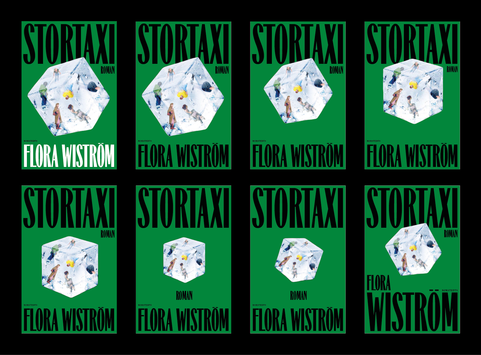 funkar kanske bättre med titeln i överkant med den kubiska isbiten. bytte till bild på en isbit som är lite rakare än i förra vändan. färgerna på de i mitten fina men kanske lite för glättiga? de till höger en test med bakgrundsfärg som matchar floras författarporträtt. men den gröna känns mest dramatisk. saker och ting står på spel. giftig nästan.