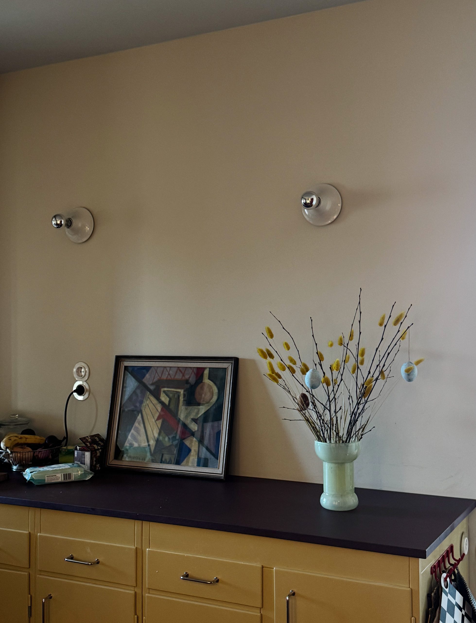 ett litet påskris och vi känner på om en tavla med en pastellteckning ska få komma upp mellan vägglamporna i köket. den plockar upp det gula i köket och det blå i taket (och eldoradovåtservetterna). men blir det för mycket. vi tänker lite till.