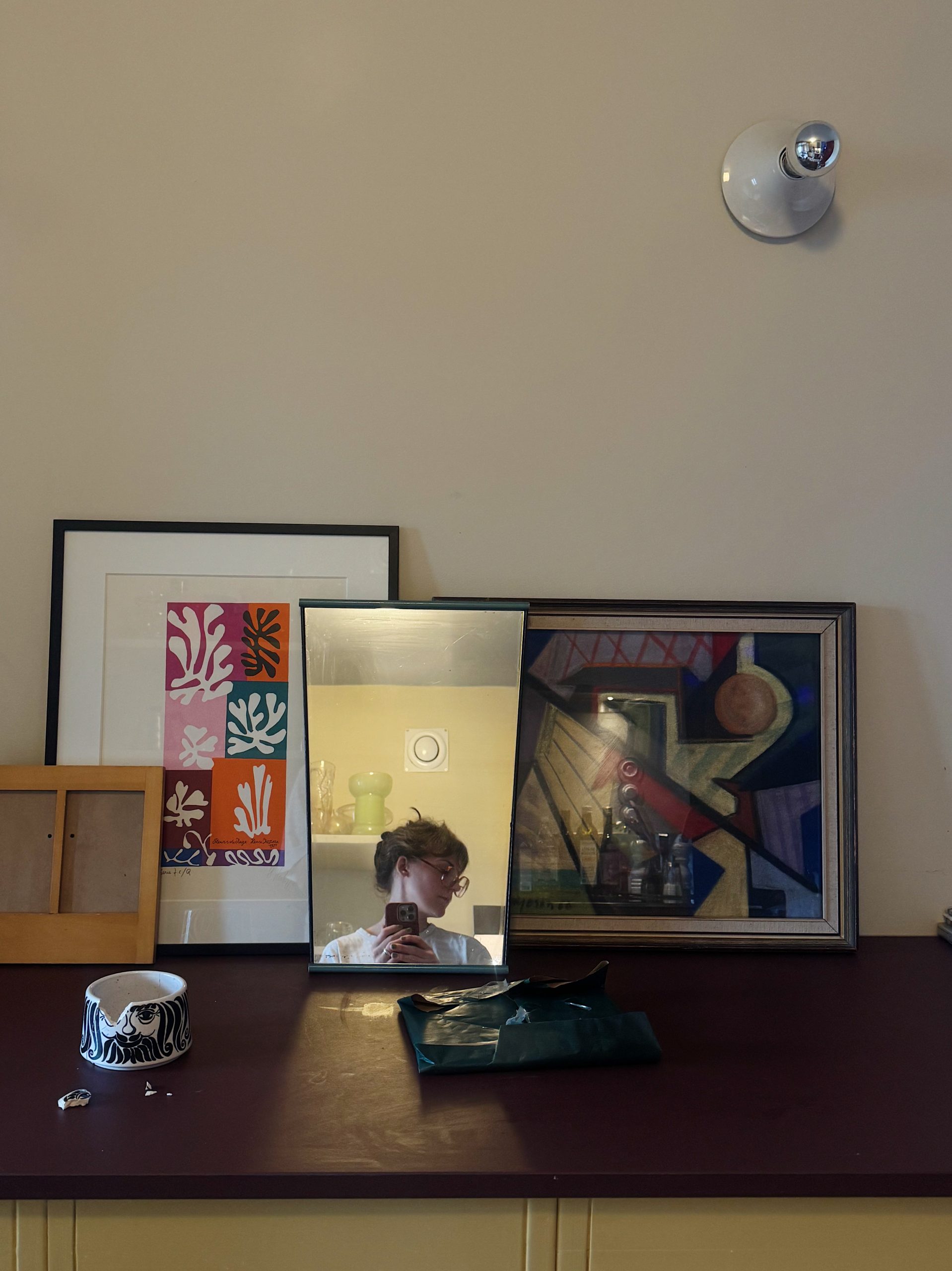 annat som berättar om lördagens hemmabestyr: en tom liten fotoram som jag sen fyllde med två engångskamerabilder. en liten kritskål som gått i golvet som jag limmade ihop igen. en spegel som jag satte upp i pias rum. och ett paket som är till hennes gosedjur alfons som fyllde år i helgen. helt perfekt inslaget av p.