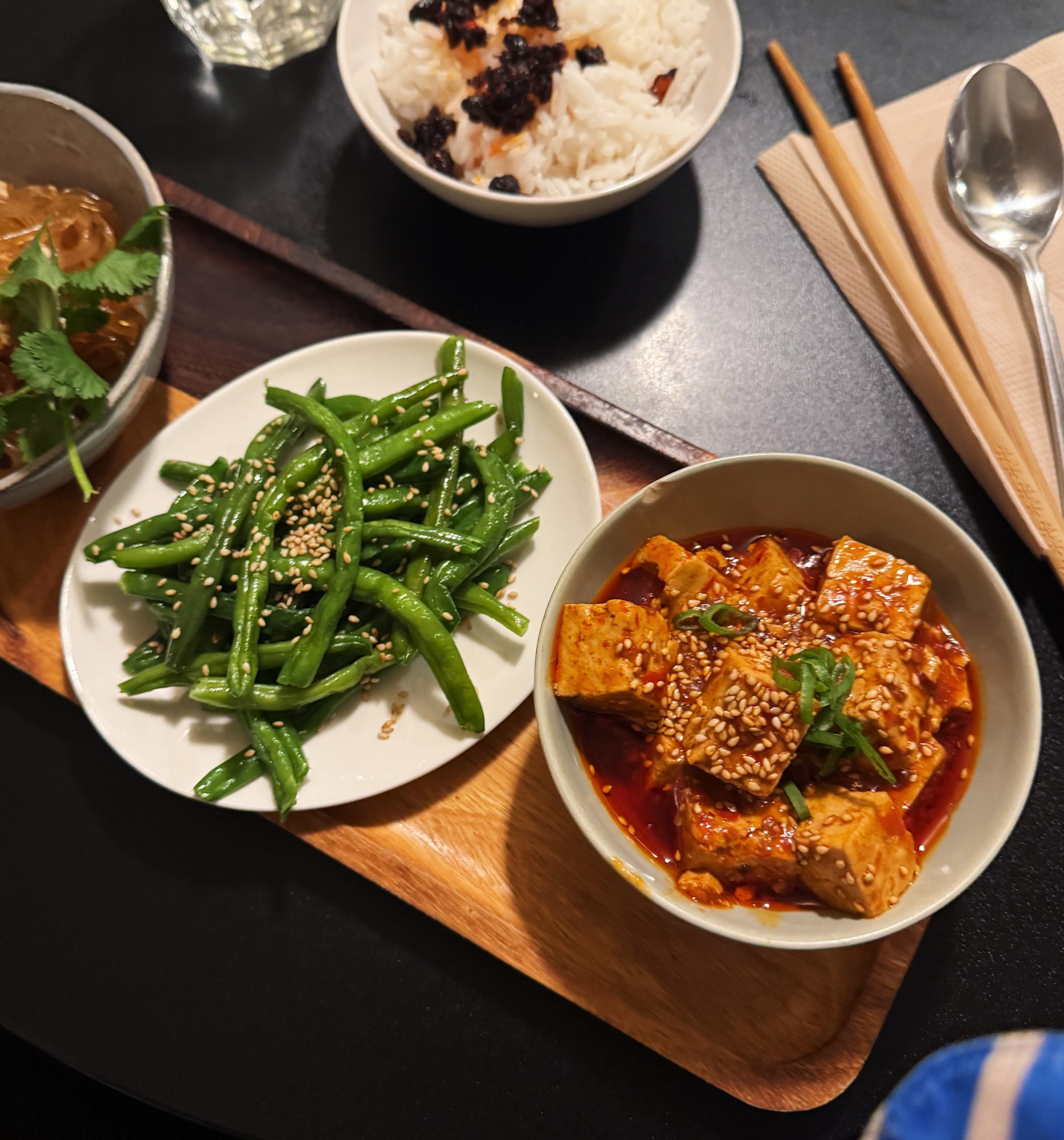 och det är så otroligt gott där. sötpotatisnudlar bönor med sesam och en stark tofugryta. och ris med krispig chiliolja till.