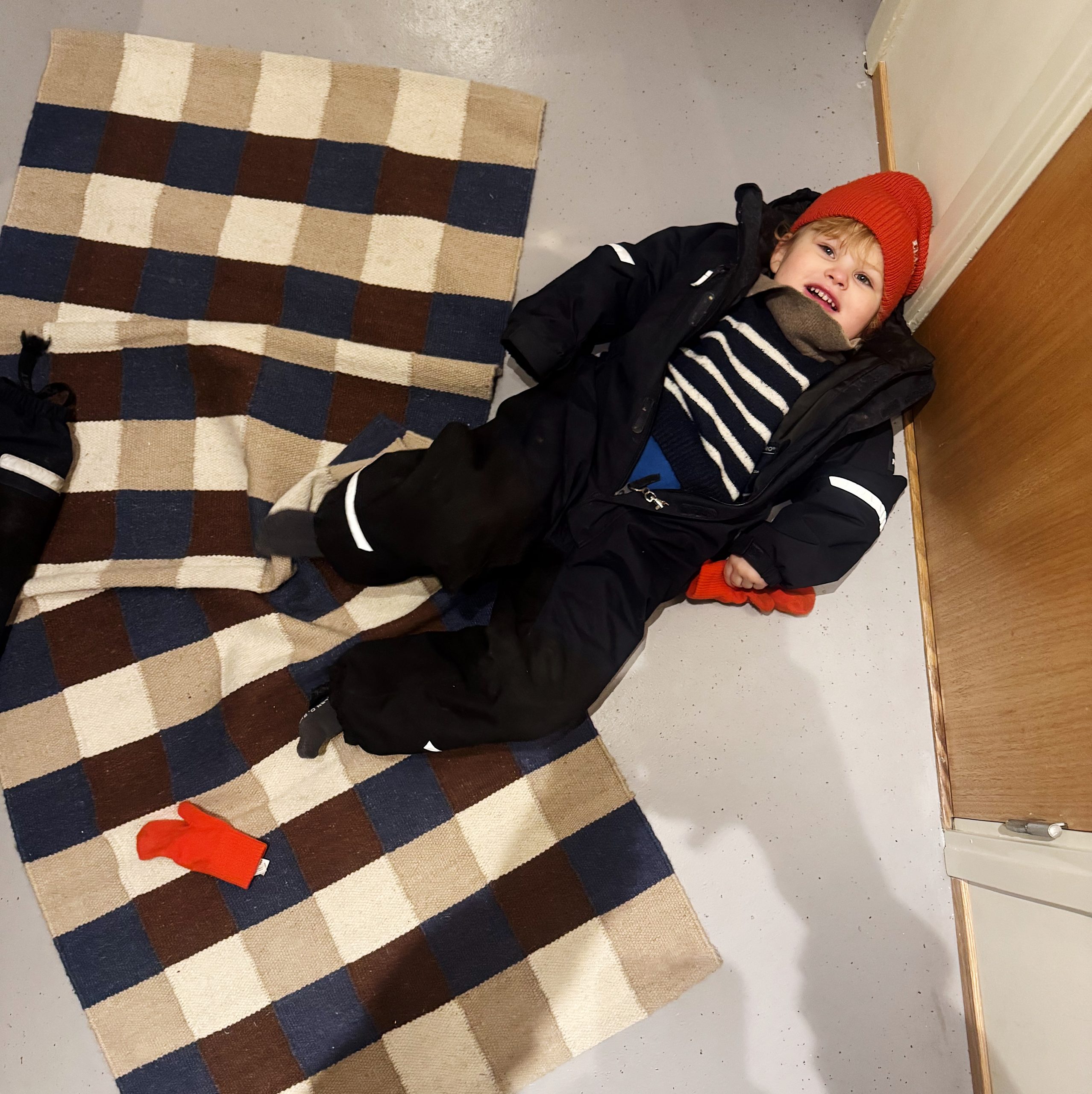 vissa vill ligga på golvet när overallen ska på.