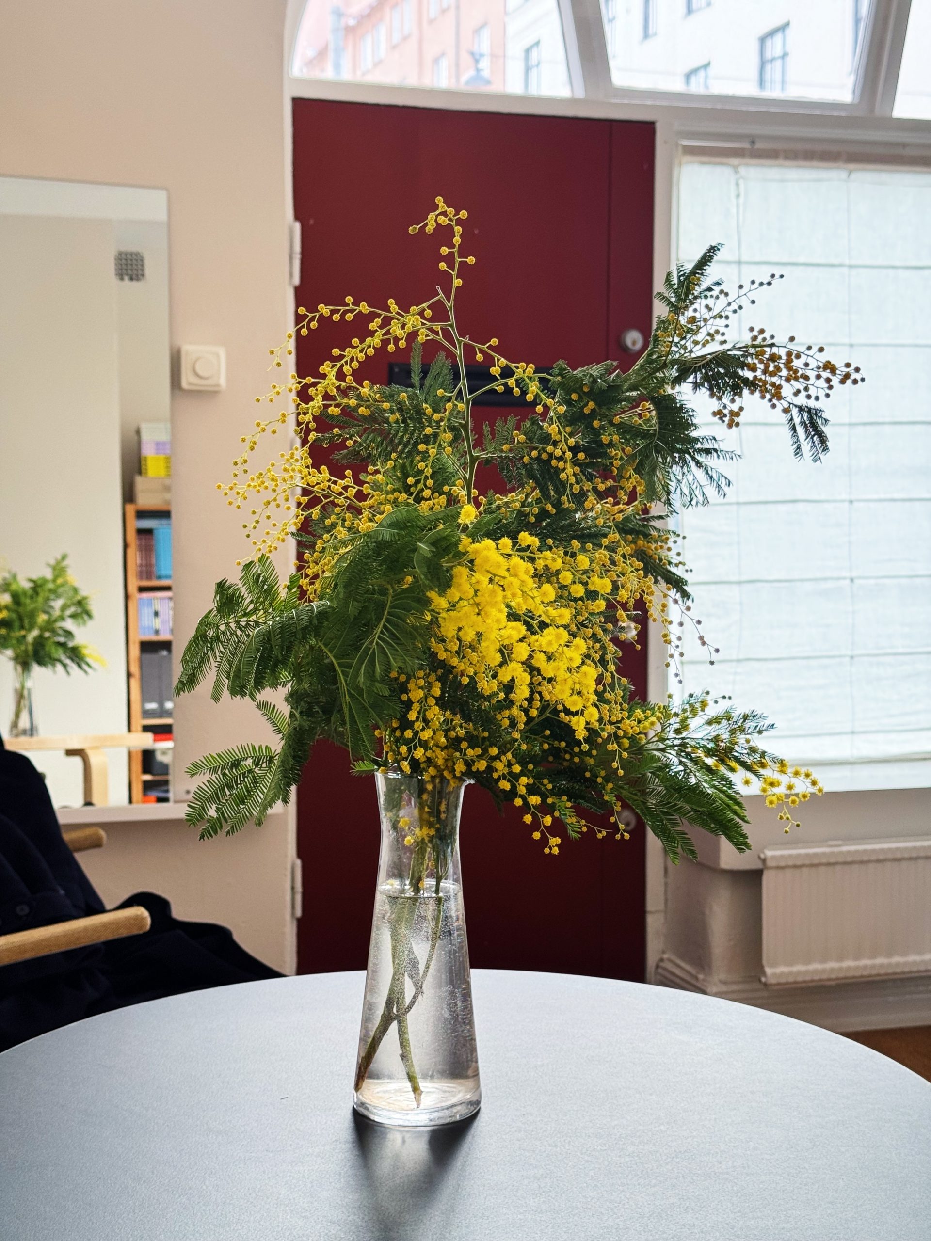 jag gick och köpte en bukett mimosa på lunchen för dagen efter skulle flora komma tillbaka från en månad i rom och återigen förgylla mina dagar på kontoret med sin närvaro.