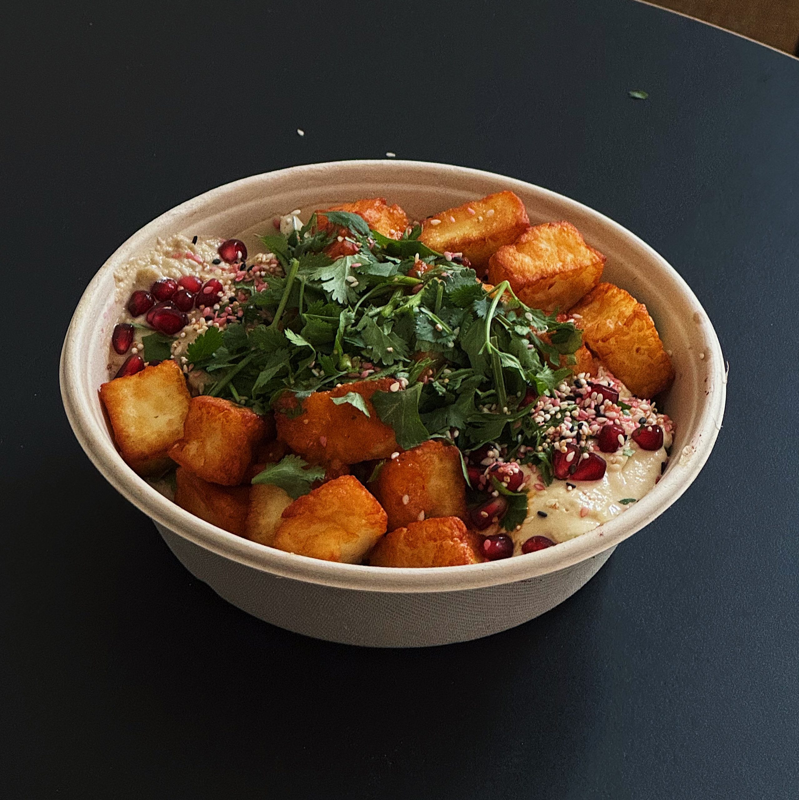 det här är babel bazaars halloumisallad. om jag inte har matlåda och ska lyxa till det (dvs inte köpa fryst spenatpaj eller en halloumi hot pot från livsen bredvid som jag gör 9/10 gånger) så blir det denna. baba ganoush hummus linssallad pickles och MASSA halloumi. stark sås och koriander på toppen tack.