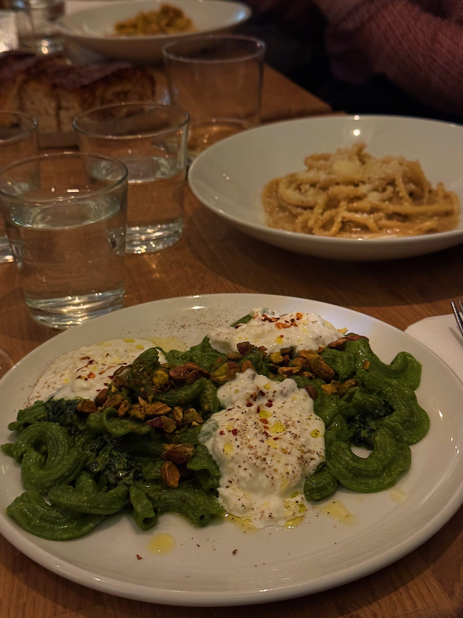 en väldigt grön pasta och sen till efterrätt en salt pistageglass med sabayonne och blodapelsin. den var så god.