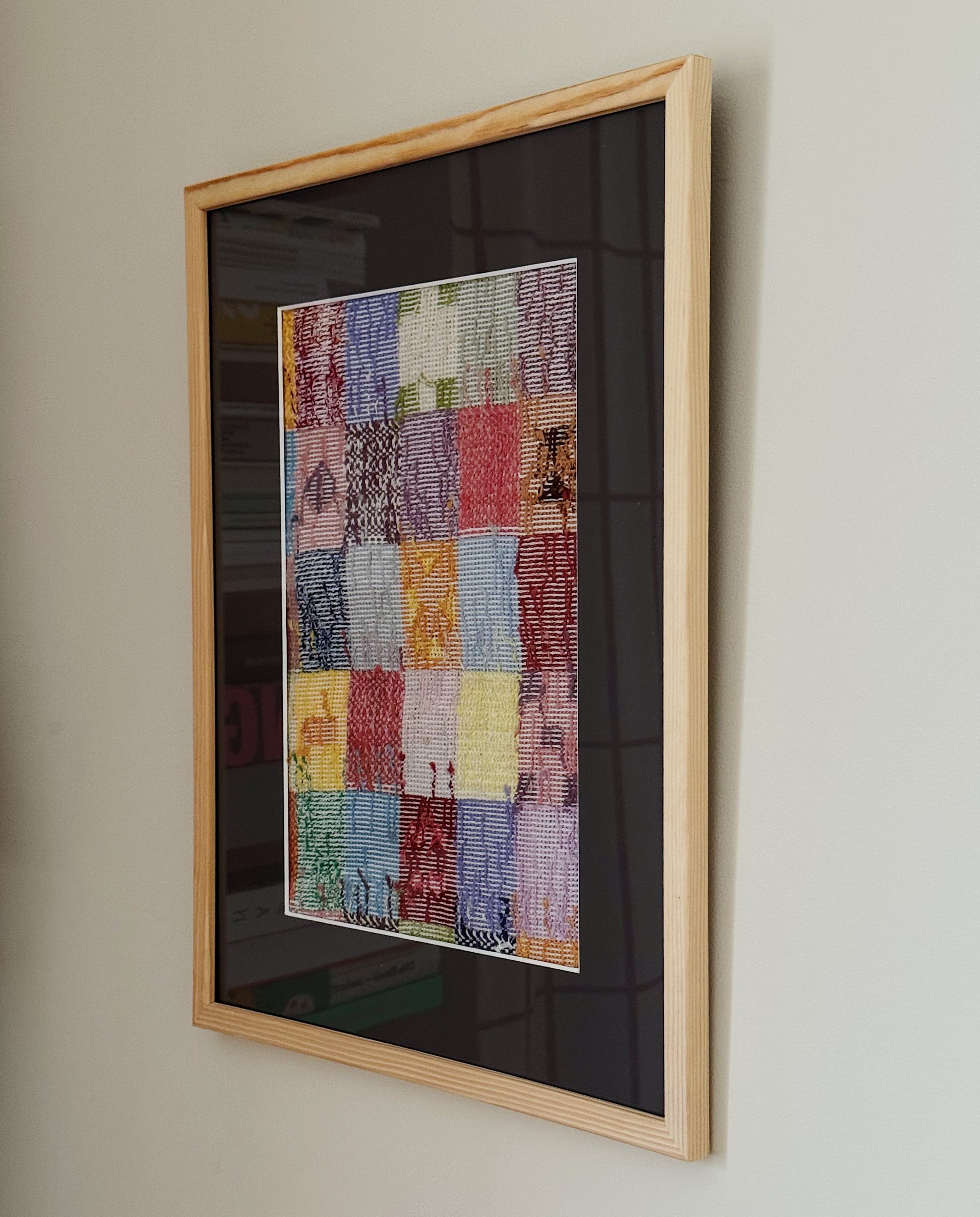 så hade vi också ett omonterat korsstygnsbroderi som jag köpt på loppis någon gång och som jag tror gjorts för att bli en kudde men jag tyckte om färgerna och mönstren så mycket att jag ville rama in den istället. har bara inte tagit mig för och nu bara tänkte jag jag köper en passepartout i närmsta storlek och så får väl utsnittet bli vad det blir.