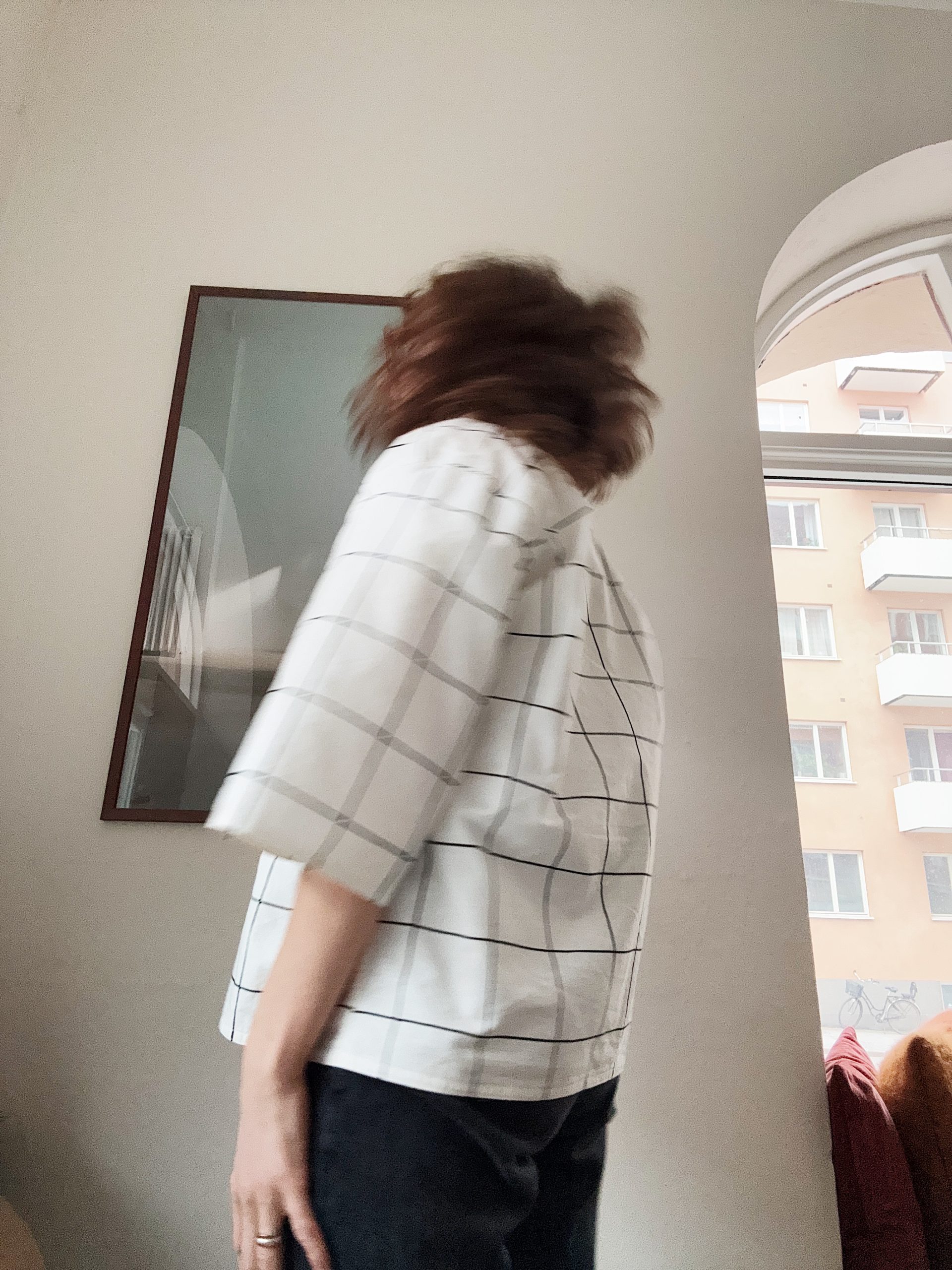 det är onsdag. jag har på mig en tischa tryckt med motiv av linnea andersson och en tunn bomullskavaj. eller vad man nu ska kalla den. tips på bra märke att söka på vinted: voukko. av den tidiga marimekkodesignern vuokko nurmesniemi.