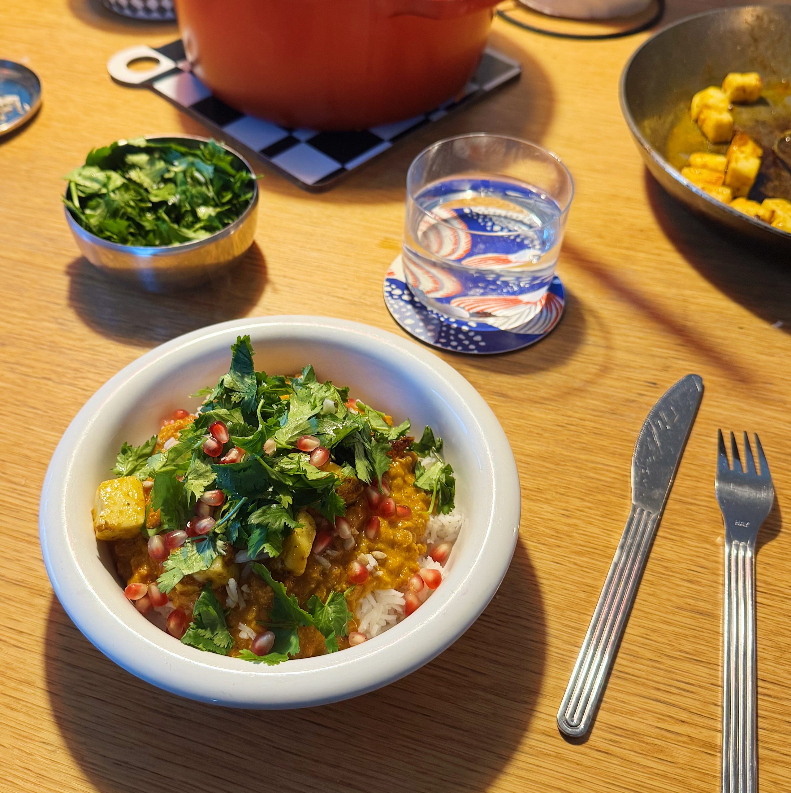 5. lagat hela två rätter efter tryckta recept. inget avancerat men det sker inte så ofta nu för tiden så det var uppfriskande. ett var makaroner med kryddig färs från buffétidningen och ett var en supergod linsgryta med harissa och blodspelsinmarinerad halloumi från julia tuvessons kokbok »tomat tomat«. se bild nedan.